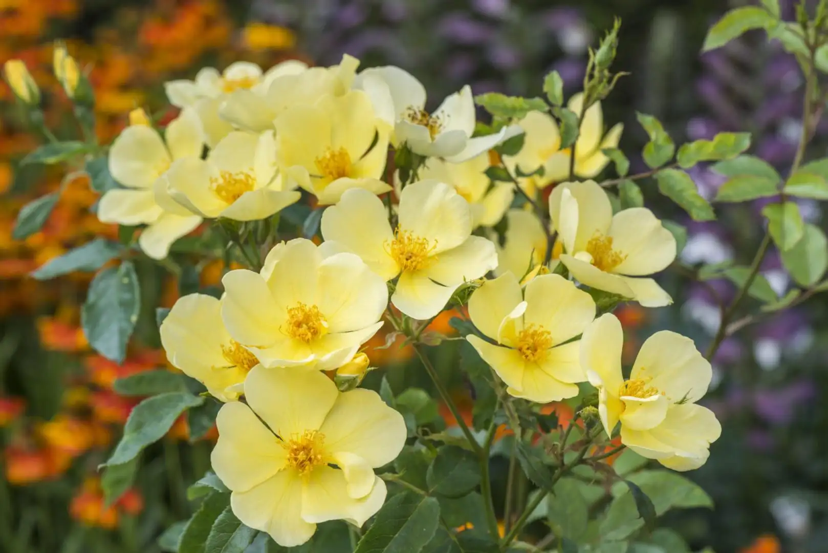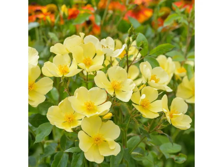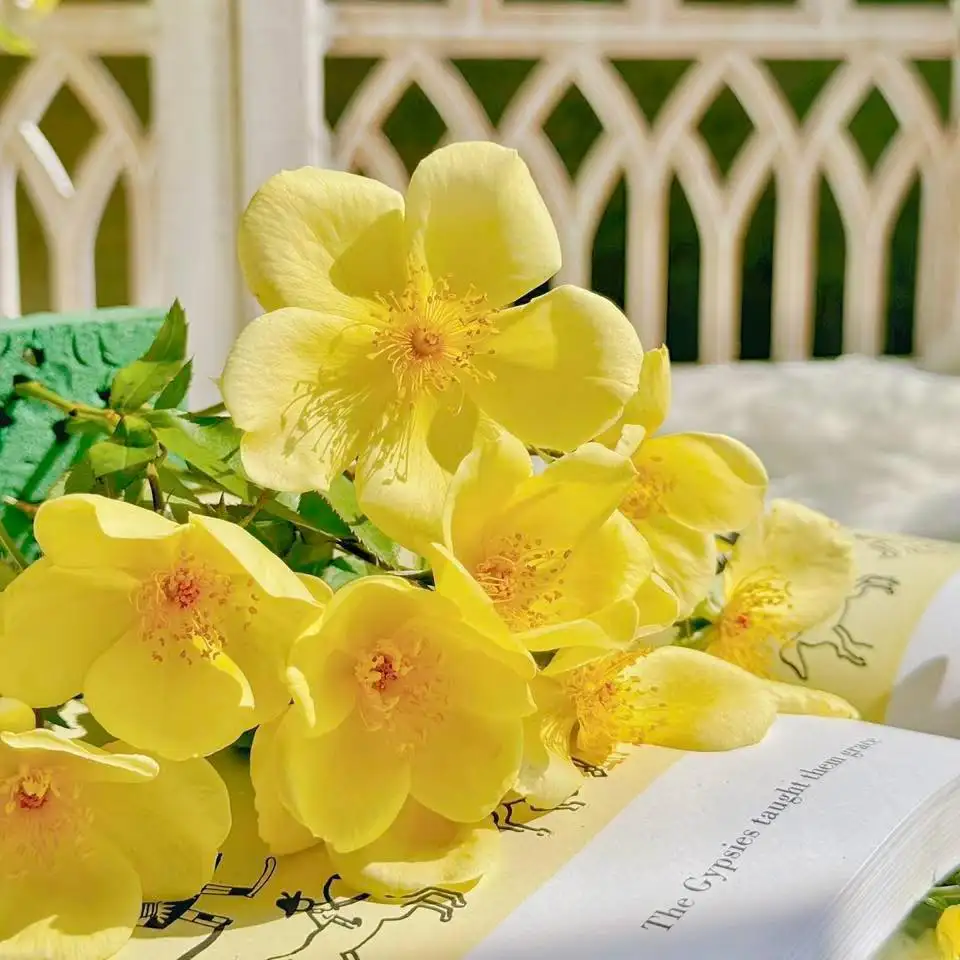 Hoa nở với 5 cánh đơn mỏng, màu vàng nhạt – vàng chanh nhẹ, để lộ tâm nhụy vàng rực, tạo cảm giác tươi sáng và rất sinh động. Khi nở rộ theo chùm, những bông hoa nhỏ xếp đều trên tán cây mang lại hiệu ứng thoáng, sáng và rất “tây”, đúng phong cách vườn Anh tự nhiên.
