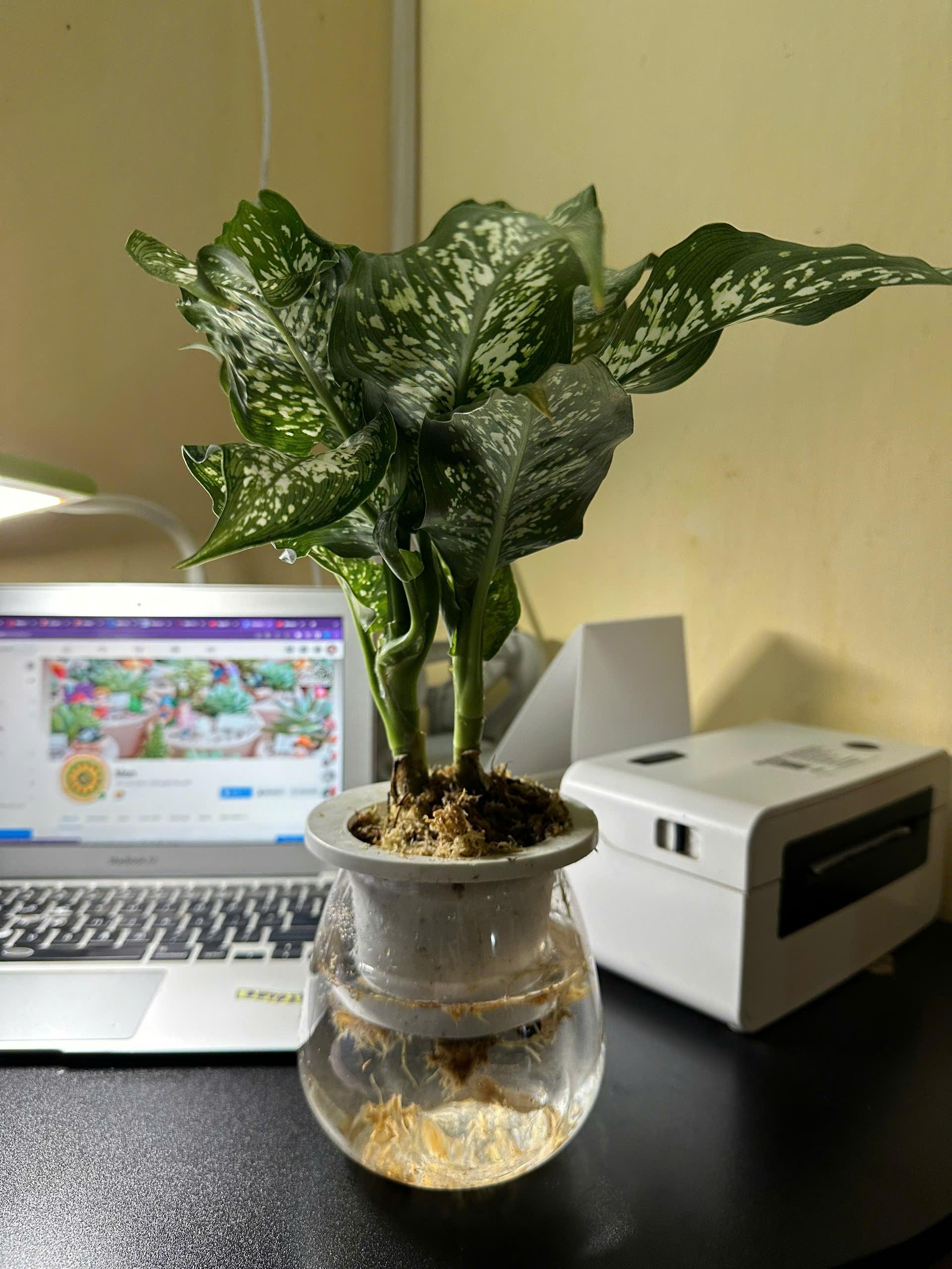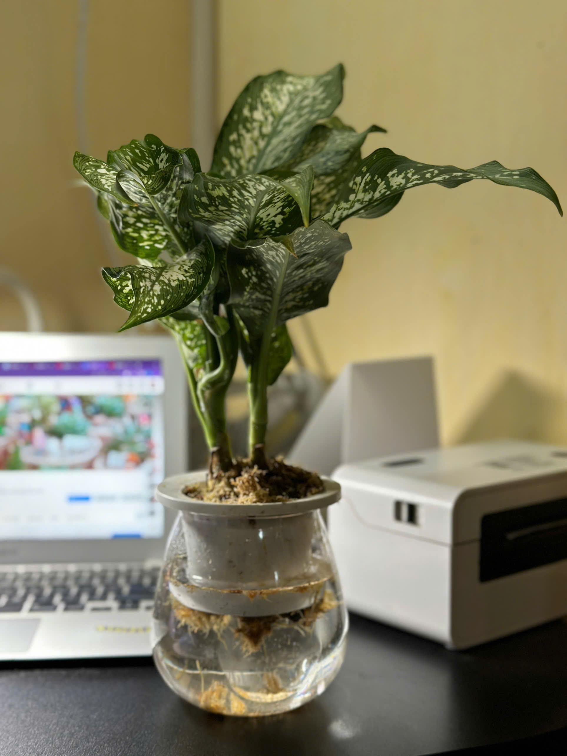 Cây Ngọc Ngân thủy sinh cao 25cm, với tán lá pha trộn giữa xanh và trắng nổi bật, là lựa chọn hoàn hảo để trang trí bàn làm việc, quầy lễ tân, phòng khách. Cây dễ chăm sóc, mang lại cảm giác tươi mát, giúp không gian thêm sinh động.