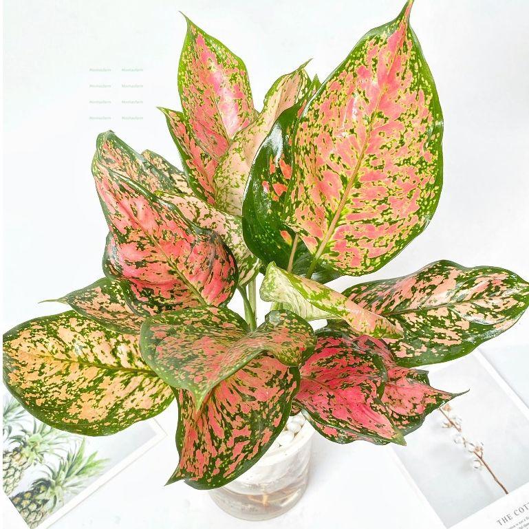 Màu sắc lá: Hồng phai điểm xanh, gân nổi bật, hoa trắng