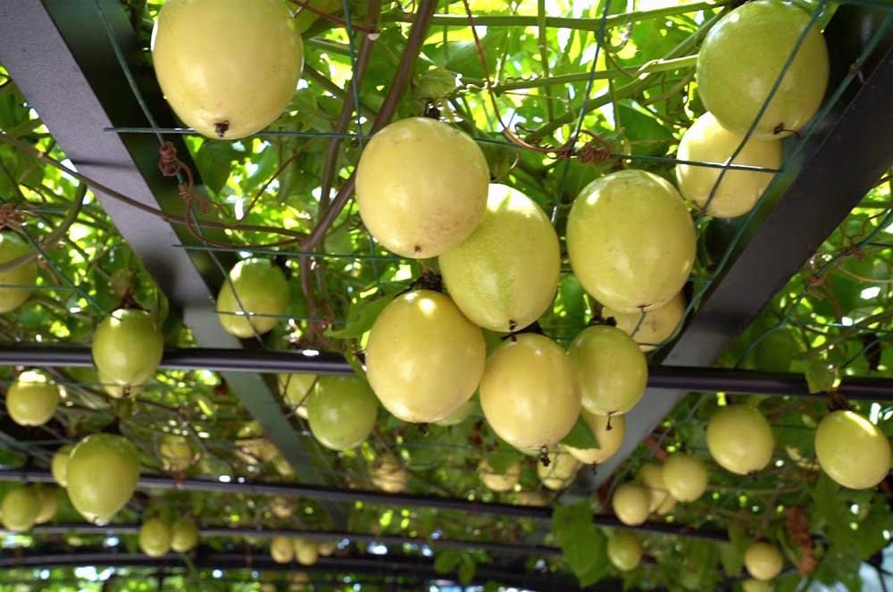 Mỗi giàn chanh leo vàng rủ xuống, lủng lẳng những quả tròn căng mọng – vừa đẹp mắt, vừa cho năng suất cao, lại có thể dùng làm nước ép, sinh tố, tráng miệng hoặc chế biến siro giải khát vô cùng hấp dẫn.